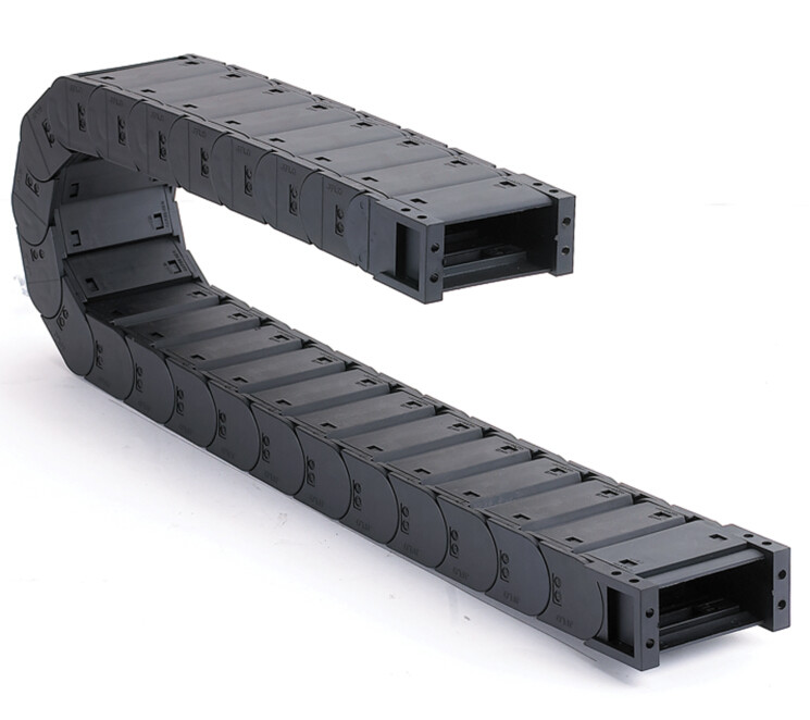 工程拖鏈用途和特點:1、拖鏈每節都能打開,便于安裝和維修,運動的噪音低、耐磨、可高速運動。 2、拖鏈已被廣泛應用于數控機床、電子設備、石材機械、玻璃機械、門窗機械、注塑機、機械手、起重運輸設備、自動化倉庫等。  3、拖鏈外形似坦克鏈,由眾多單元鏈節組成,鏈節之間轉動自如。 4、相同系列的拖鏈內高、外高、節距相同,拖鏈內高、彎曲半徑R可有不同的選擇。 5、單元鏈節由左右鏈板和上下蓋板組成,拖鏈每節都能打開,裝拆方便、不必穿線,打開蓋板后即可把電纜、油管、氣管等放入拖鏈內。